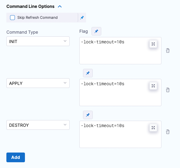 This setting allows you to set the Terraform CLI options for Terraform commands depending on the Terraform step type. For example: -lock=false, -lock-timeout=0s.
