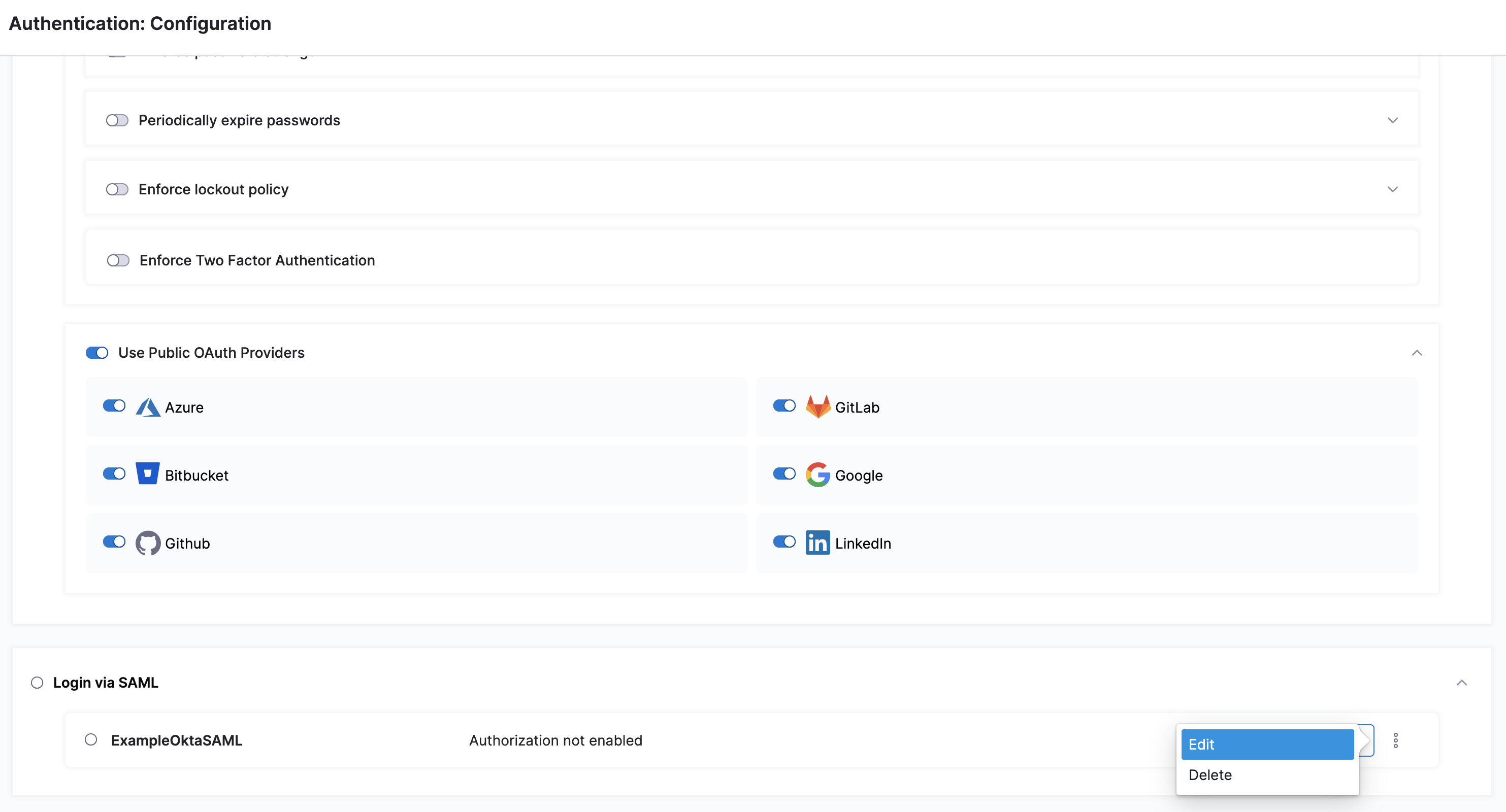 6. Select Add. Your Okta configuration appears under Login via SAML.