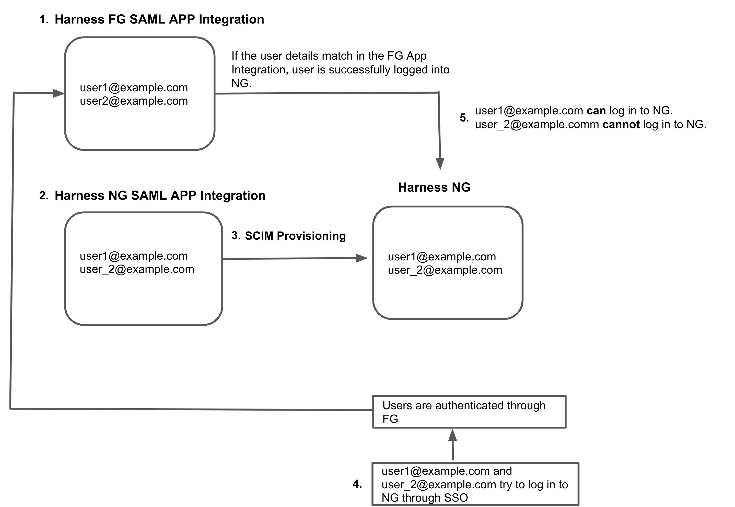 user1@example.comis a member of the FirstGen App Integration. They are successfully authenticated and logged in to Harness NextGen.user_2@example.comis not a member of the FirstGen App Integration. Authentication fails and the user can't log in to Harness NextGen.